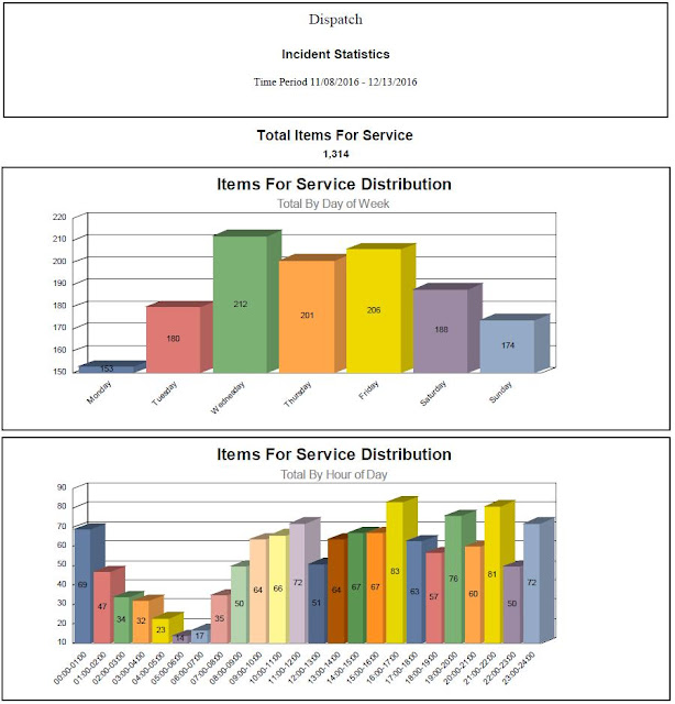 CalCom Report: For a period between 11/08/2016 and 12/13/2016 the police department received 1314 calls for service.